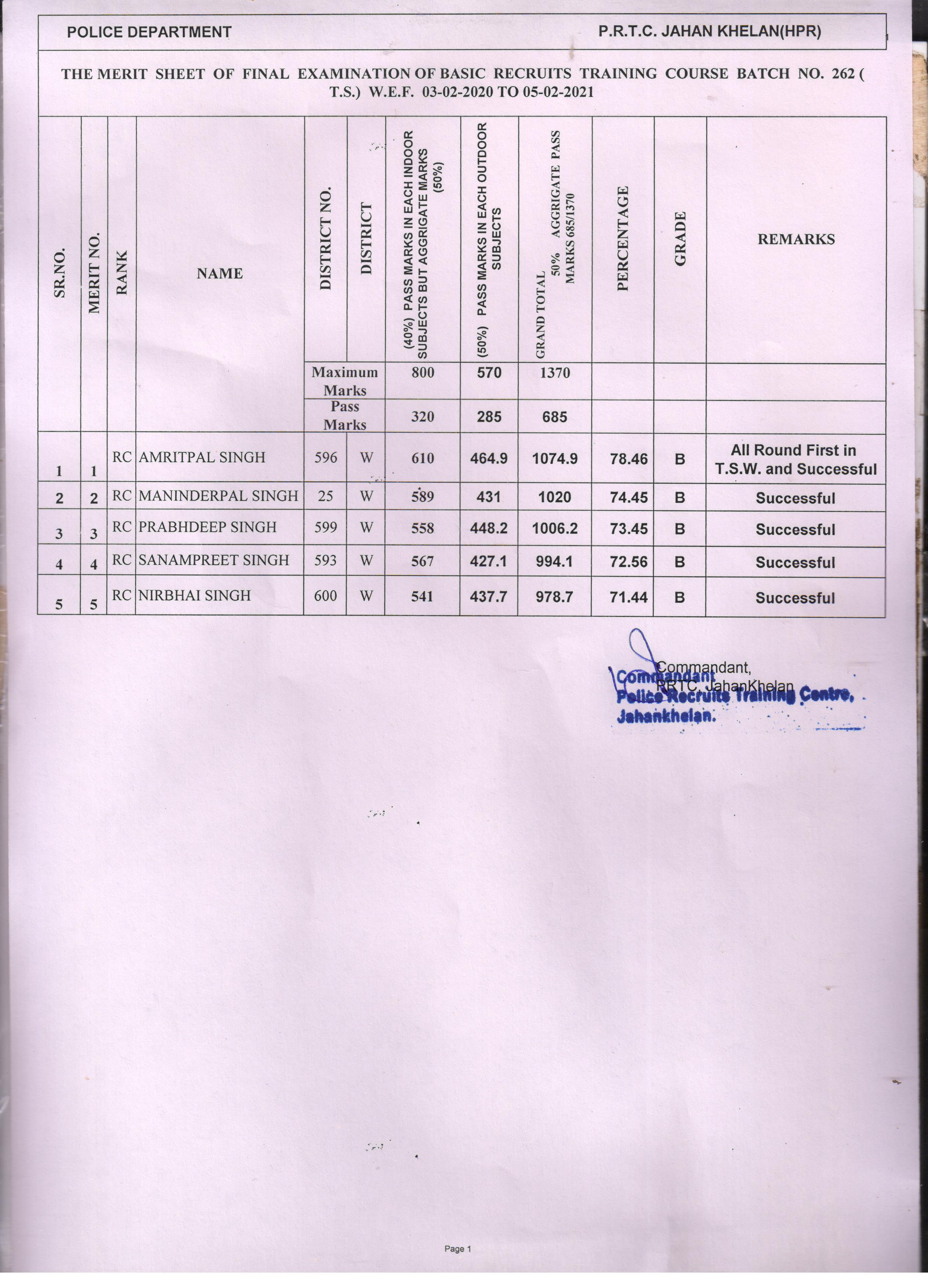 Result Sheet of Batch No 262 (TS Wing)